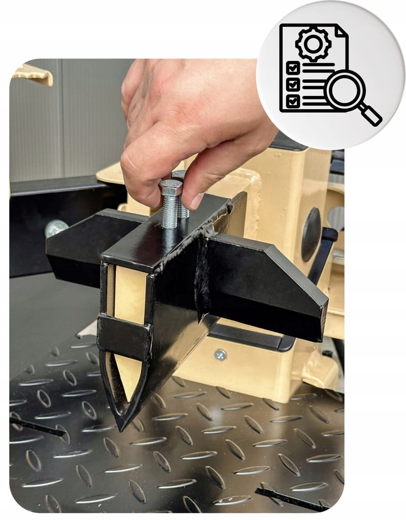 Regulowany stolik roboczy z dodatkowymi blatami bocznymi – zapewnia wygodę pracy z różnymi rozmiarami drewna.